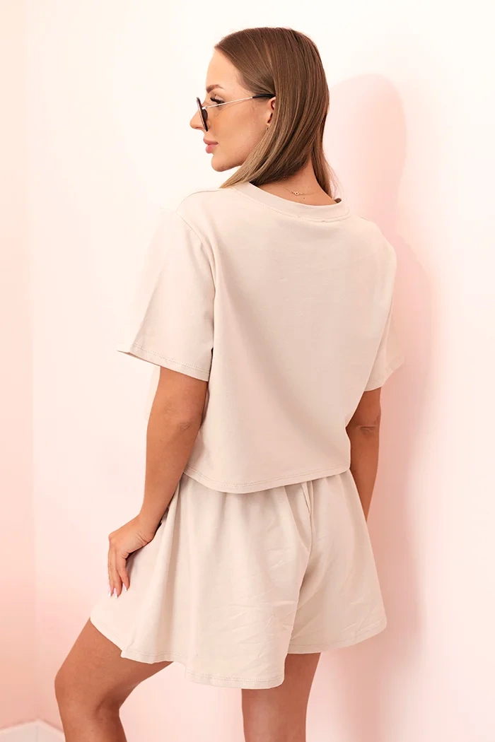 - Дизайн: свободна тениска и широки шорти с ластик на талията