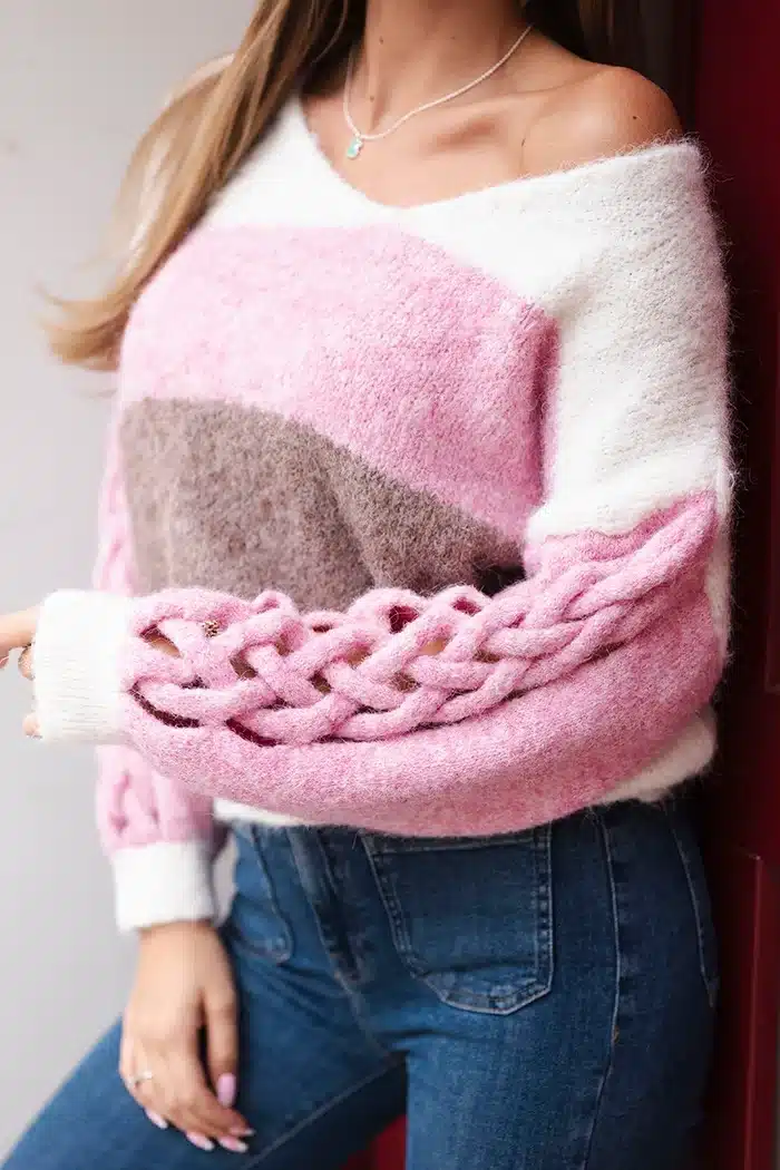Дамски Пуловер с плитки на ръкавите – Бежово розов – IT96-1