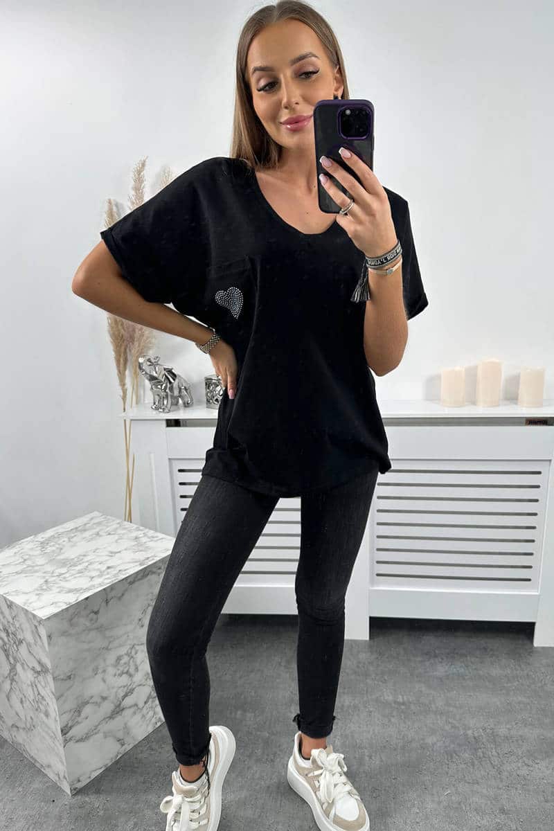 Тази памучна блуза с V-образно деколте и джоб е идеалният избор за летните дни. Изработена е от памук, за да е удобна. V-образното деколте придава женственост, а джобът на гърдите – небрежност. Тази блуза е идеална както за ежедневни, така и за официални поводи и е изключително универсална част от гардероба. Размерът е универсален и ще подхожда на дами, носещи размер S, M или L.
