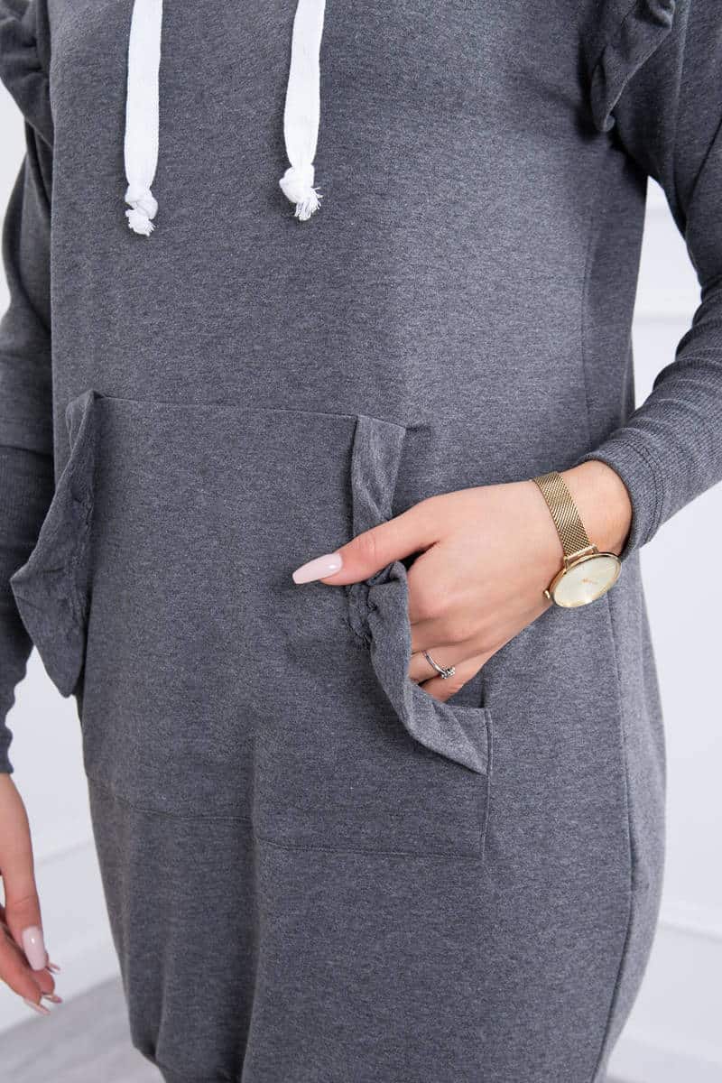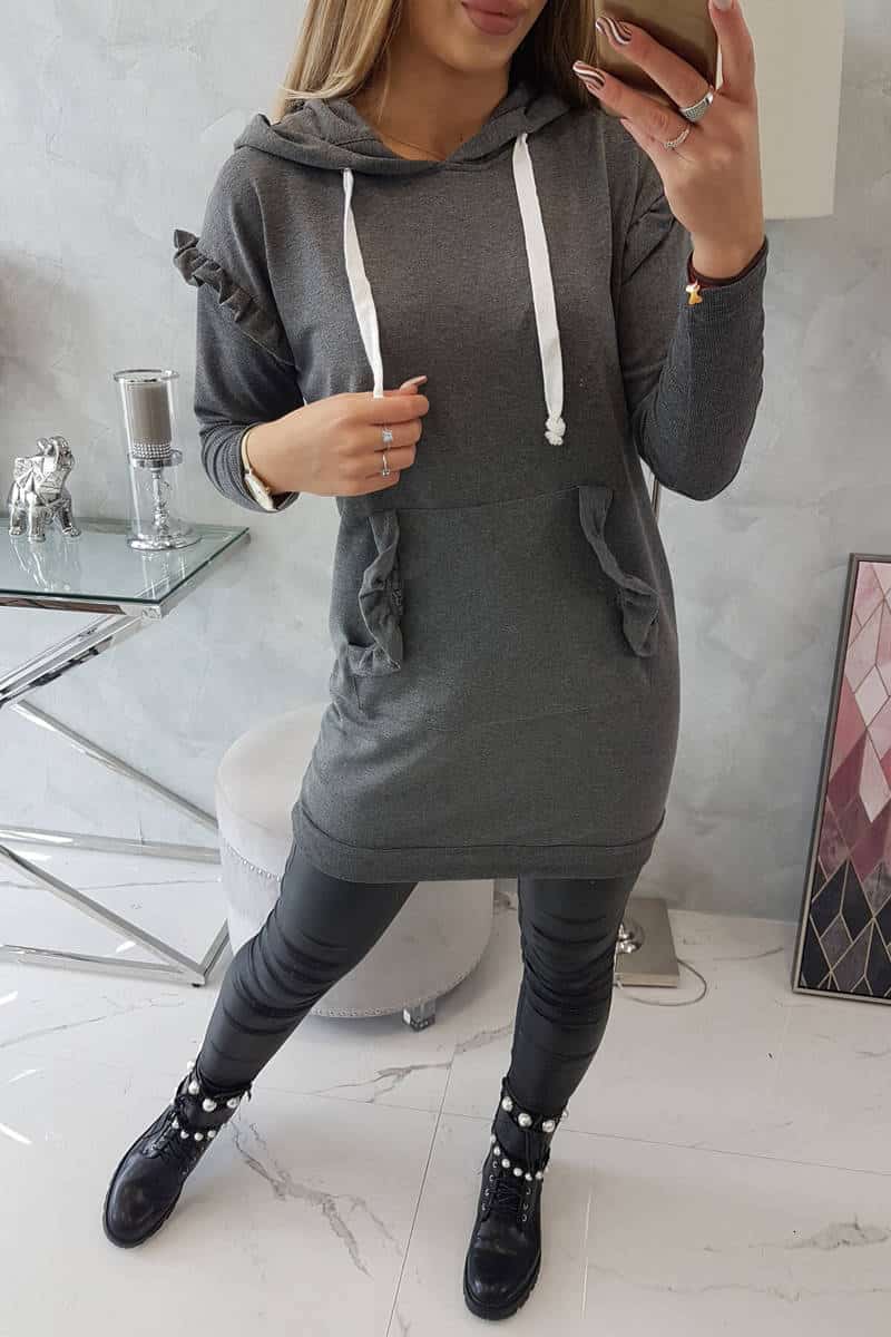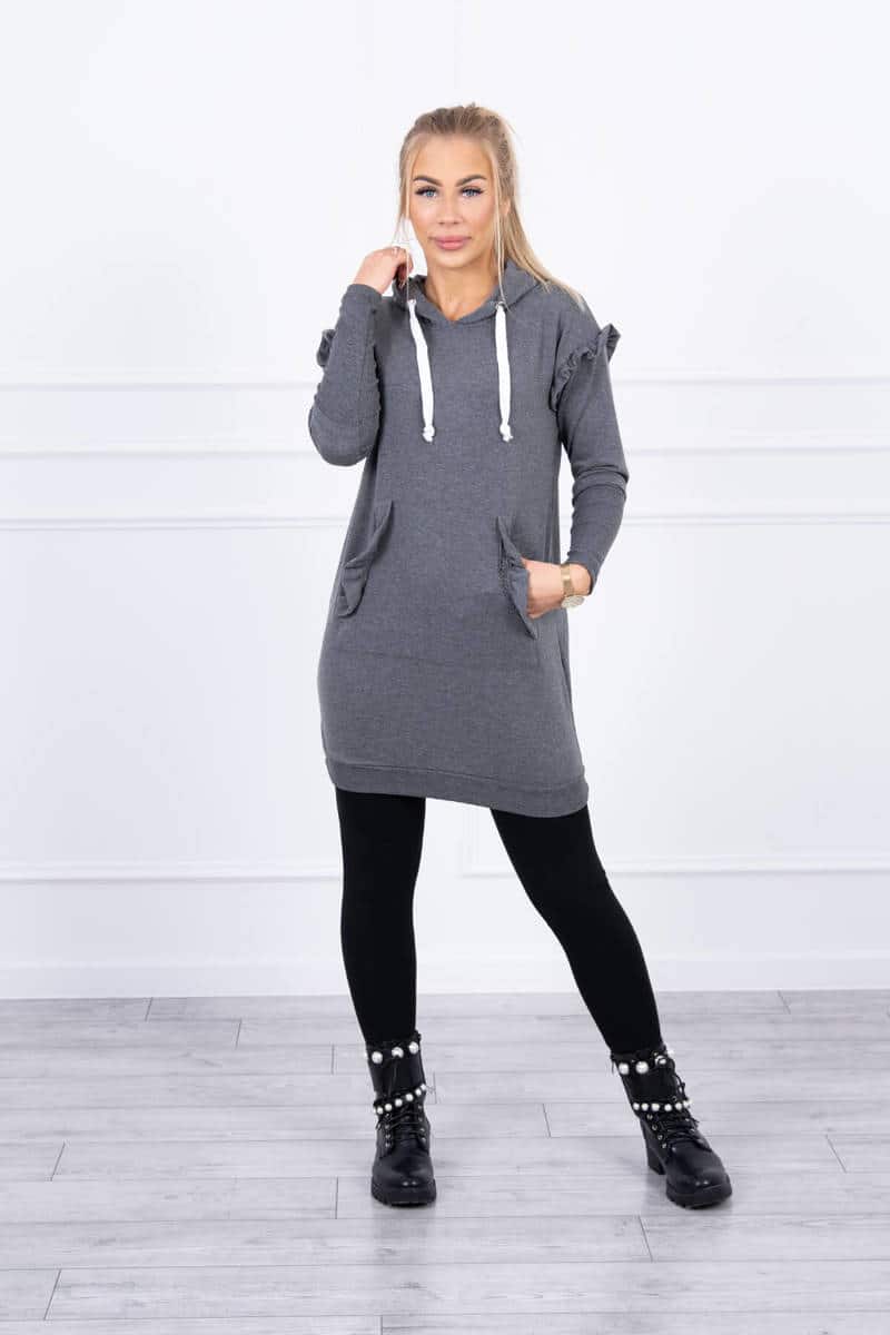 Представяме ви една модерна рокля. Роклята е с качулка и джоб отпред. Роклята има декоративни волани на ръкавите и на джоба. Перфектна ежедневна дреха. Роклята е изработена от висококачествен материал. Размерът е универсален и ще бъде подходящ за дами, носещи размер M, L или XL