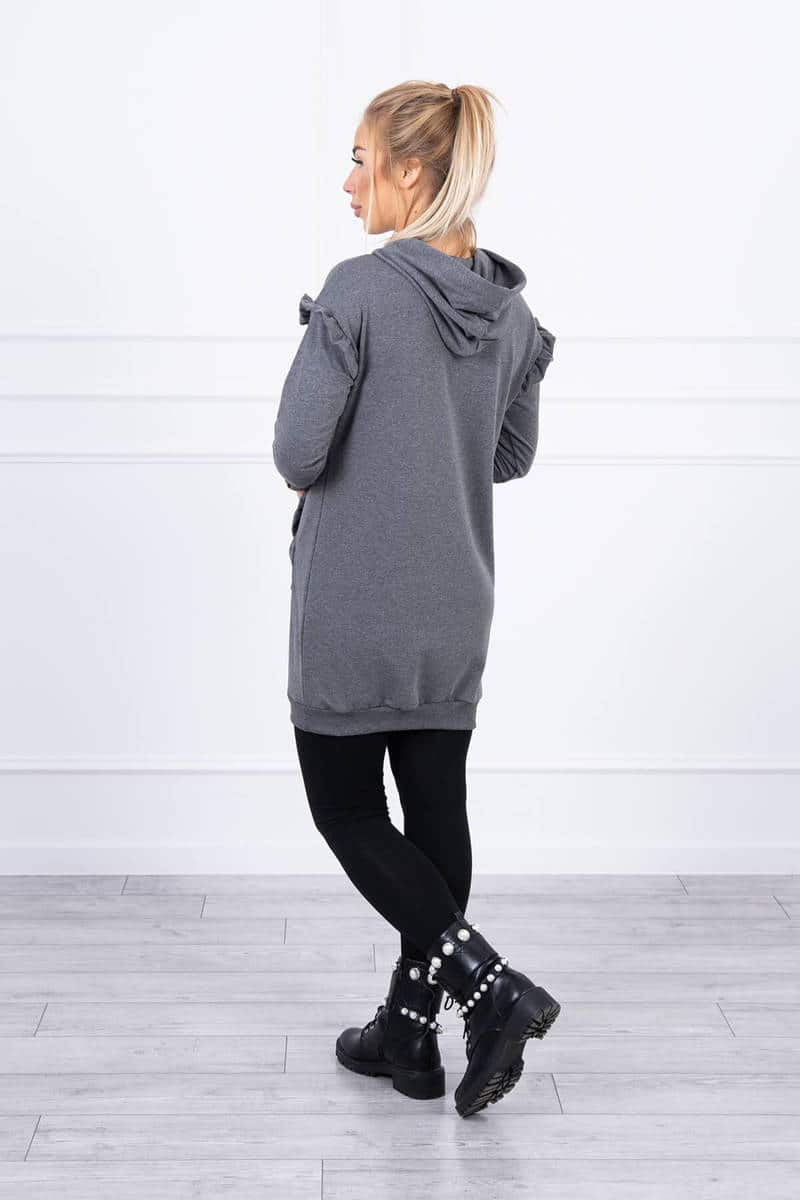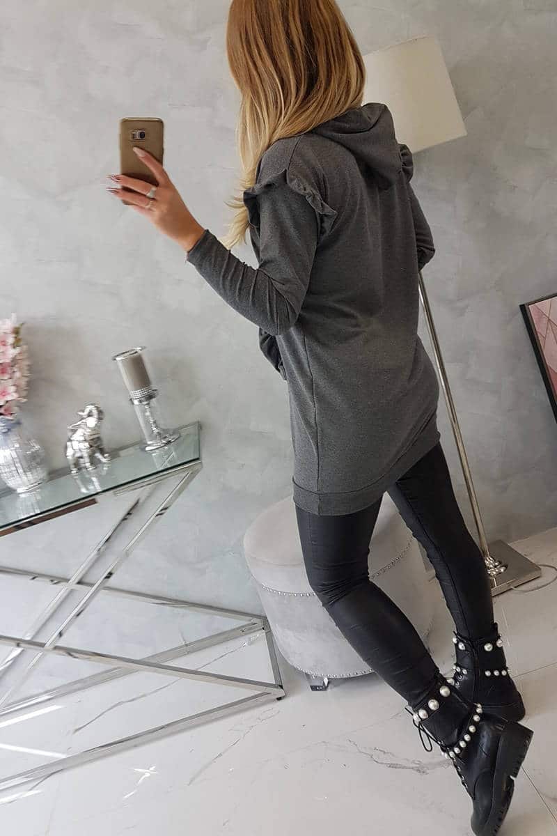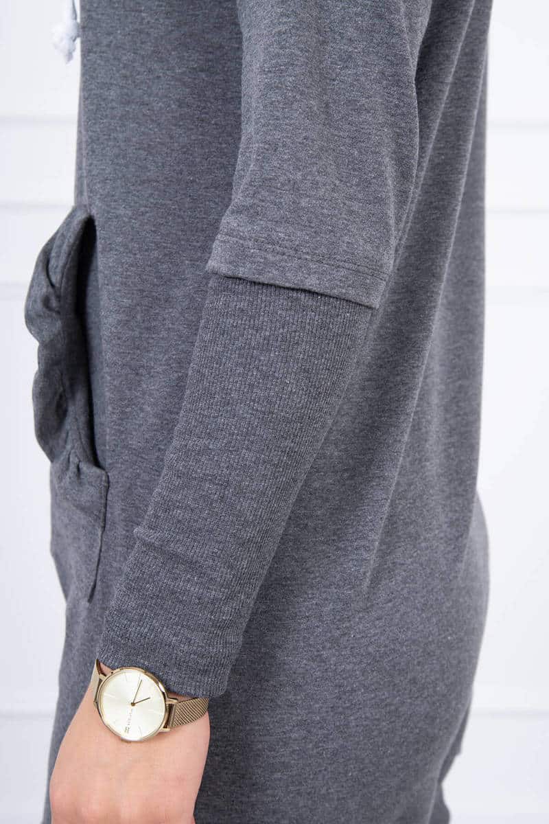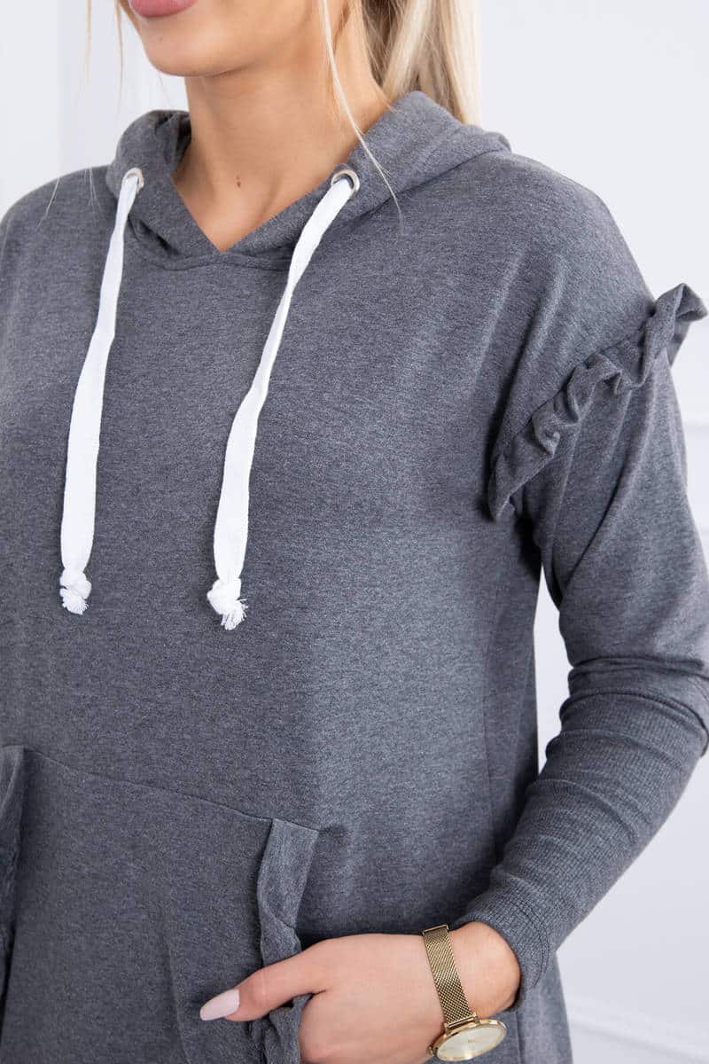 Представяме ви една модерна рокля. Роклята е с качулка и джоб отпред. Роклята има декоративни волани на ръкавите и на джоба. Перфектна ежедневна дреха. Роклята е изработена от висококачествен материал. Размерът е универсален и ще бъде подходящ за дами, носещи размер M, L или XL
