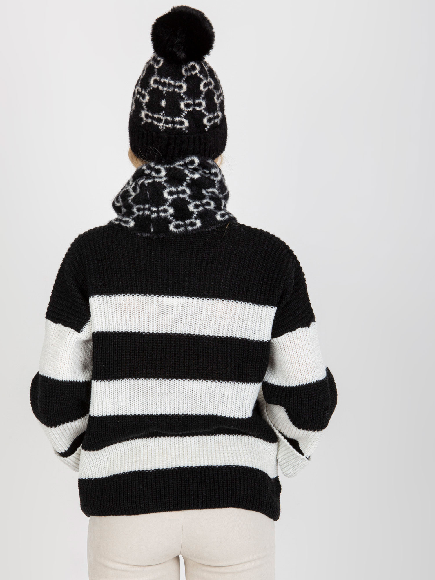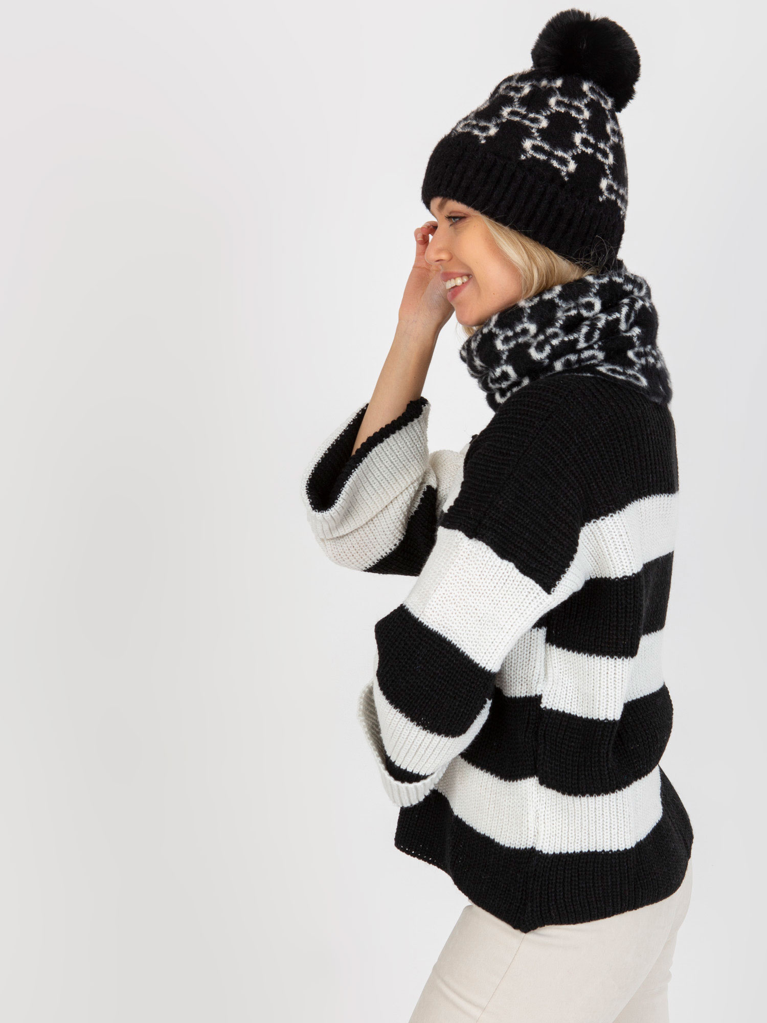 Зимна шапка в черно и бяло, обкантена с шарен помпон, идеална за студените дни. ❄️